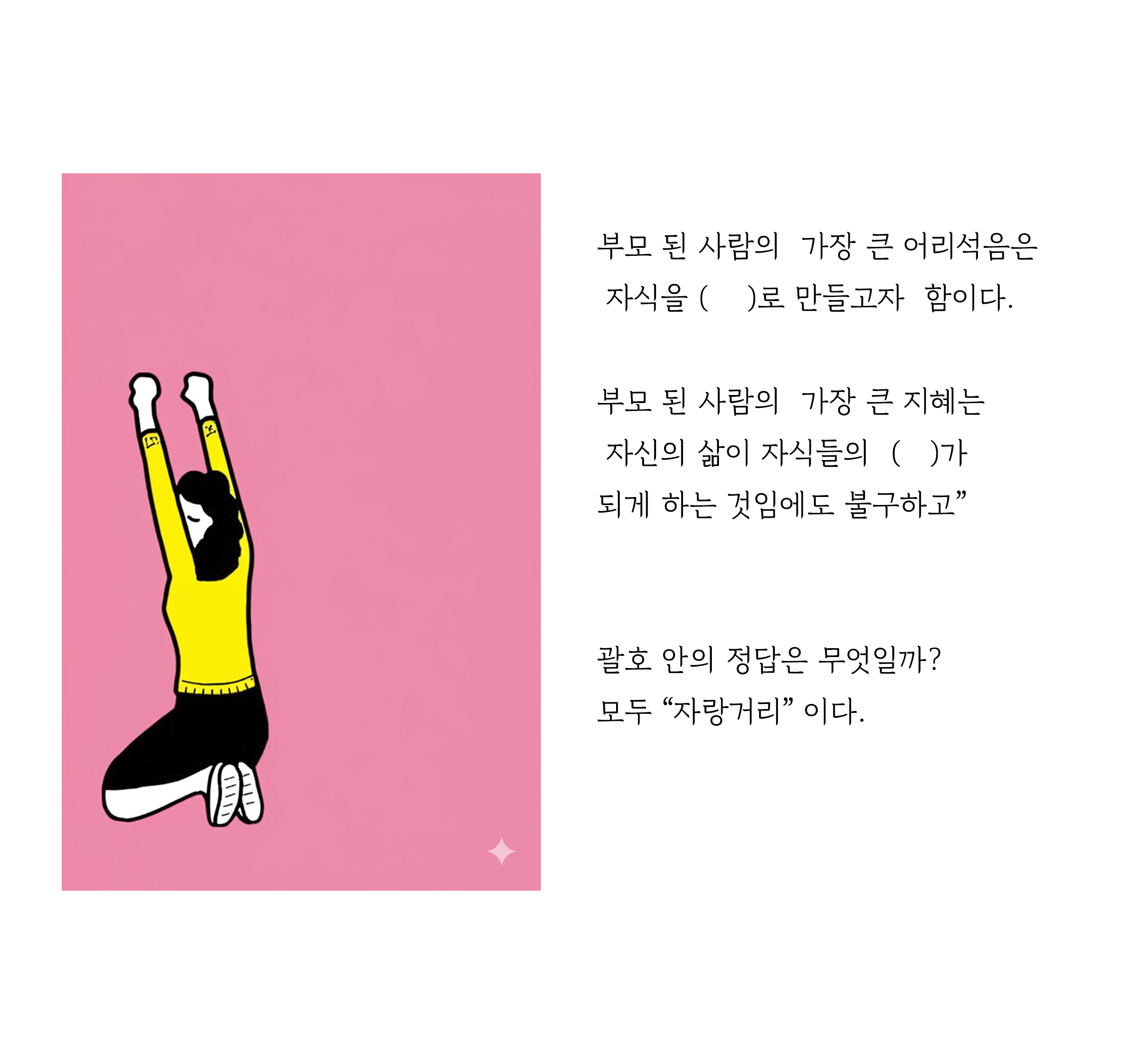 <엄마 반성문>의 저자인 이유남 작가는 스스로를 이렇게 고백하고 있다. “ 그동안 나는 부모가 아니었다. 관리자이고 감시자이고 통치자였구나. 그것도 아주 무섭고 나쁜!” 그리고 다음 괄호 안에 무엇이 들어가는지에 대해 질문을 하고 있다. “부모 된 사람의 가장 큰 어리석음은 자식을 ( )로 만들고자 함이다. 부모 된 사람의 가장 큰 지혜는 자신의 삶이 자식들의 ( )가 되게 하는 것임에도 불구하고” 괄호 안의 정답은 모두 “자랑거리”라고 작가는 말하고 있다.